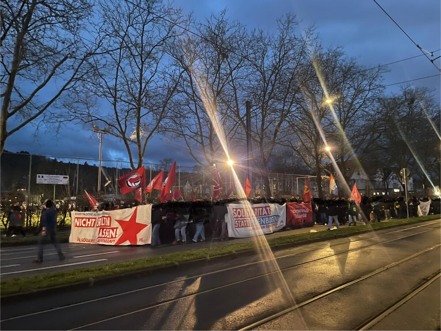Bis zu 1800 Menschen versammelten sich am Mittwoch nachmittag den 11. Februar am Europaplatz um gegen die Afd Wahlkampfveranstaltung zu protestieren. Nach den Reden, der kommunistischen Gruppe - gemeinsam Kämpfen, Freiburg gegen Rechts, zur Situation in Rojava, von widersetzen und der Linken, zog die Menschenmenge zum Zähringer Bürgerhaus. Hunderte trotzten dem anfänglichen Regen und wurden dann mit bisschen Sonne und Sonnenuntergangsglow beglückt. Der Demozug endete friedlich vor den Absperrungen der Polizei in Zähringen.