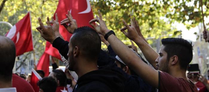 Turcos2.JPG "graue Wölfe" 2014 in MünchenLizenz: Keine (all rights reserved)Quelle: http://www.netz-gegen-nazis.de Die grauen Wölfe sind eine ultrarechte Bewegung türkischer Nationalisten in der Türkei, die auch in migrantischen Communities in Deutschland eine Rolle spielen.