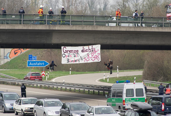 Zu einer Strafe von 35 Tagessätzen wurde eine Aktivistin an diesem Donnerstag den 11. Oktober 2018 vor dem Freiburger Landgericht verurteilt. Ihr wurde vorgeworfen psychische Beihilfe zur vollendeten Nötigung geleistet zu haben. Am 2. April 2016 hatten AktivistInnen aus Deutschland und der Schweiz im Rahmen der No Border Action Days kurzzeitig die A 5 kurz vor dem Grenzübertritt Basel blockiert. Neben Protestierenden auf der Autobahn hatten sich zwei Personen auch mit Transparent von einer Brücke abgeseilt. Der Angeklagten war nun vorgeworfen worden, dadurch dass sie neben dem Seil gestanden habe, habe sie dabei geholfen, die Autos zum Anhalten zu nötigen. In der ersten Instanz war sie vom Amtsgericht Lörrach zu 20 Tagessätzen wegen Beihilfe zu versuchter Nötigung verurteilt worden. In einer mittaglichen Prozesspause, noch vor der Urteilsverkündigung sprachen wir mit der angeklagten Aktivistin und ihrem als Pflichtverteidiger beigeordneten Anwalt Lukas Theune: