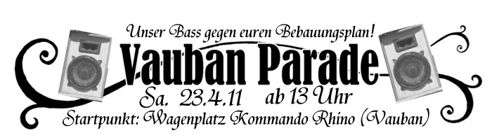 vaubanparade23.4.klein.jpg Lizenz: Keine (all rights reserved) Themen der Sendung: Johann-Sebastian-Bach-Straße: Straßenfest und Solidemo Bass-Parade am 23.04. um 13Uhr von Kommando Rhino Naziaufmarsch am 1. Mai in Heilbronn verhindern! Antifanews: Die Wege Ungarns - Proteste gegen Neonaziaufmarsch zum 1.Mai in Halle - Prozeß gegen Sturm 34 Mitglieder in Dresden