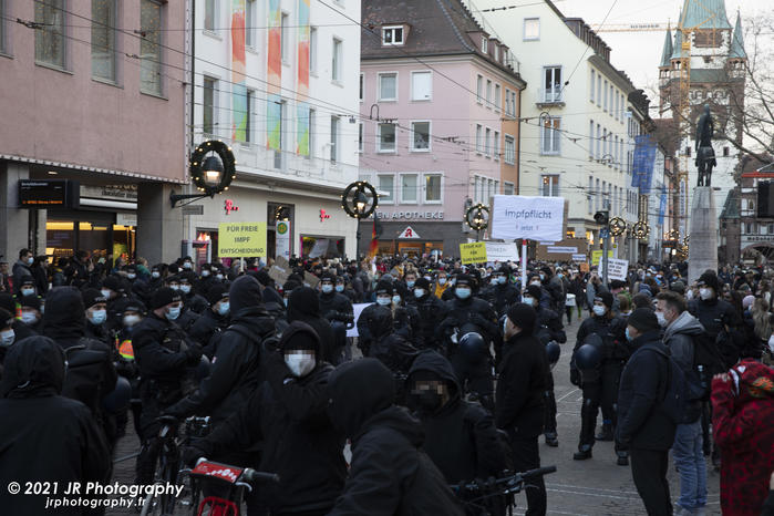 Vergangenen Samstag, den 27. November 2021 fand erneut eine Demonstration der Querdenken-Abspaltung "FreiSeinFreiburg" statt. Antifaschistischen Gegenprotest gab es auch wieder, z.B. in Form einer Mahnwache und von Fahrradblockaden der Demonstrationsroute.