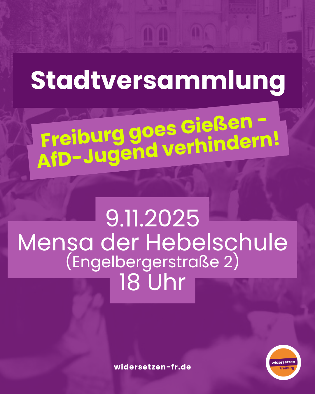 Gegen die Neugründung der Jugendorganisation der AfD wird es am 29. November in Gießen Proteste mit mehreren Tausend Personen geben. Das Aktionsbündnis Widersetzen ruft dazu auf und organisiert die Proteste mit. Anlässlich der Freiburger Stadtversammlung des Bündnisses am 9. November in der Hebelschule (Engelbergerstr. 2) haben wir uns mit Carlu von Widersetzen über den Anlass und die Vorbereitungen unterhalten.