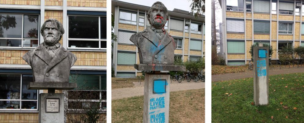 Vor dem Anatomie-Gebäude der Uni Freiburg steht jetzt ein leerer Sockel. Seit 1890 bis vor kurzem stand darauf die Büste des Anatomen und Anthropologen Alexander Ecker. Im Zuge der Black-Lives-Matter-Bewegung wurde die Büste mit Farbe bespritzt und infolgedessen vom Sockel abmontiert, um gereinigt zu werden. Was jetzt weiter mit dem Denkmal passieren wird, ist noch nicht entschieden. Julia Rensing und Heiko Wegmann aus dem Forschungs- und Bildungsprojekt Freiburg postkolonial.de fragen sich, wofür das Denkmal heute steht und wie ein angemessener dekolonisierender Umgang mit ihr aussehen könnte.